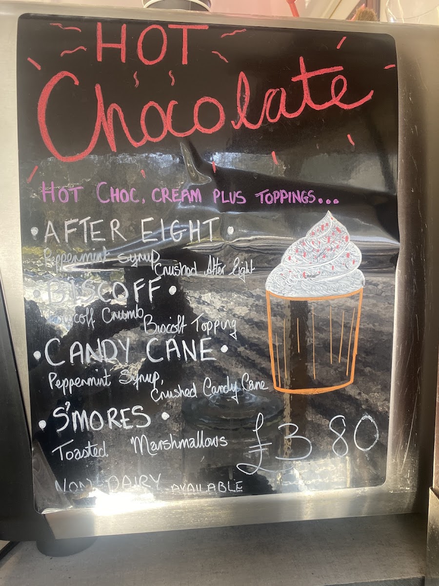 Drinks include hot beverages such as hot chocolate with customizable additions like cream, syrup shots, and non-dairy milk alternatives.